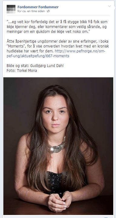 Det er nemlig knyttet stor stigma til det å være syk i huden i Norge i dag. I 2011 ble det gjennomført en spørreundersøkelse vedrørende hudlidelse og stigma i Norge, og resultatet er dessverre ikke oppløftende. Undersøkelsen viser at mange opplever ulike former for stigma og diskriminering på grunnlag av sykdommen. Mange opplever å få spørsmål om det er smittsomt eller vondt, og flere kan opplyse om at de blant annet har blitt nektet tilgang til svømmehallen. Det finnes mye uvitenhet rundt de ulike diagnosene, og det kan oppleves tungt og slitsomt for den diagnostiserte å leve i en kollektiv uvitenhet hvor de til stadighet må forklare seg selv. I 2013 valgte derfor åtte ungdommer å fortelle åpent fra sine liv som «annerledes» i boka Moment. Organisasjonen har fått utallige gode tilbakemeldinger på boken, og PEF-ung er derfor stolte over å ha med Fordommer Fordummer i arbeidet med å knuse mytene tilknyttet diagnosene våre!